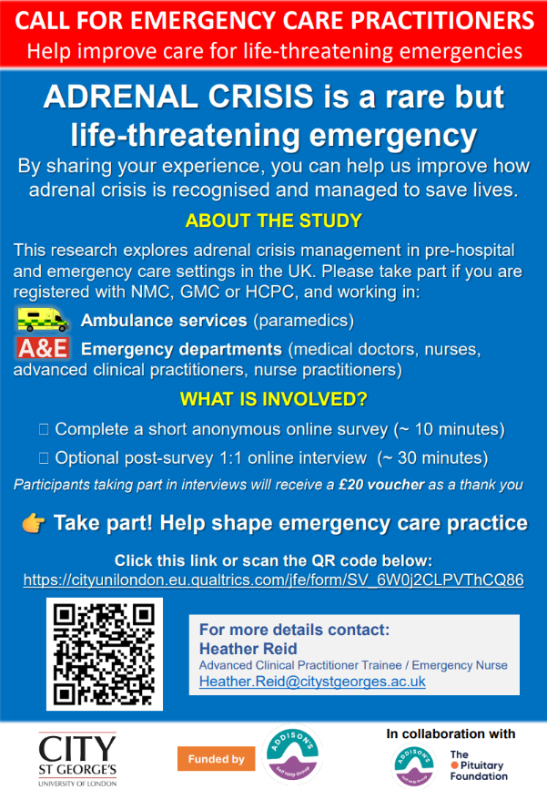 This study wants to hear from people working in emergency care settings, to find out how adrenal crisis is currently being recognised and managed. Emergency care settings include Accident and Emergency departments and ambulance services.
