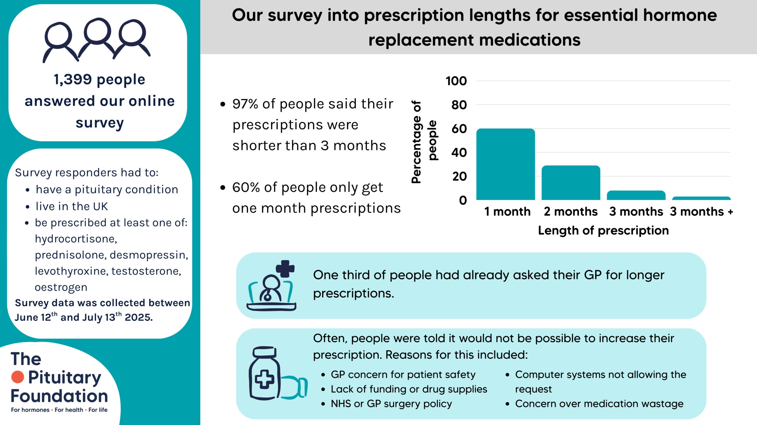 These findings highlight that many people are not getting long enough prescriptions to adequately manage their pituitary conditions, and that there is a need here for clinicians to support patients to receive longer prescriptions.