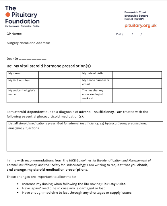 These letters can be shared with your GP to ask them to increase the prescription length for your hormone replacement medication. There are two versions of this letter: one for people with adrenal insufficiency who take replacement steroids, and one for people who take any of the other specified hormone replacements. If you have adrenal insufficiency and other hormone deficiencies, you can fill out and send both letters to your GP.