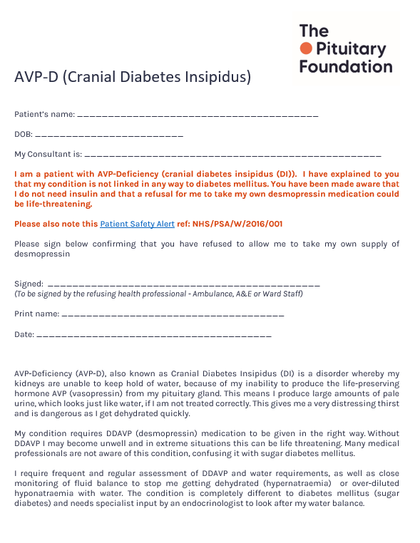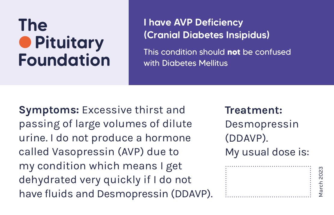 An awareness card for people with AVP deficiency, to inform others of their condition and medical needs.