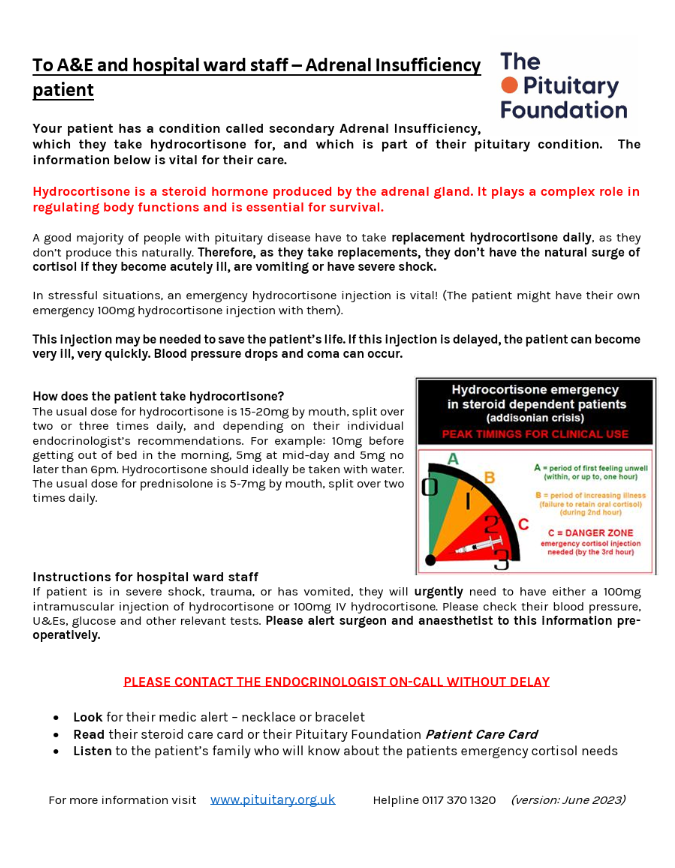 An information sheet for patients with adrenal insufficiency to give to A&E and hospital staff. This explains your condition and what care you need.