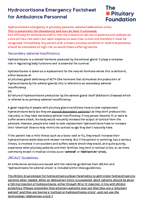 An information sheet for ambulance staff to help them understand your hydrocortisone needs in an adrenal crisis.