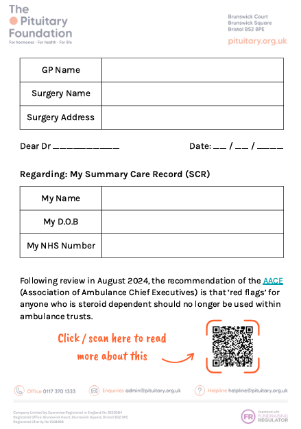 A template letter to fill out and share with your GP to make sure your adrenal insufficiency diagnosis is recorded on your Summary Care Record.