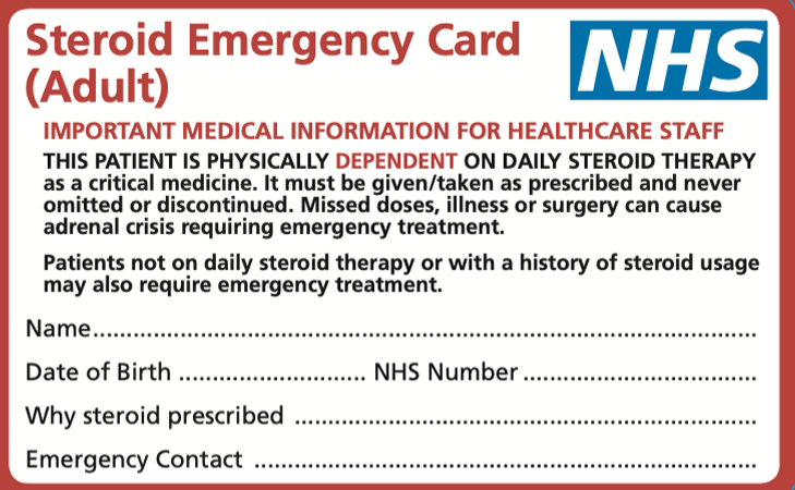 An emergency alert card for adult patietnts with adrenal insufficiency, to alert others to your need for replacement steroids.