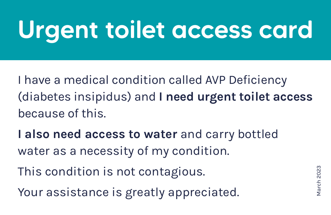A toilet access card for people with AVP deficiency, to request access to toilets in public.