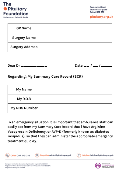 This template letter has details of your pituitary condition and can be sent to your GP, to ask them to update your Summary Care Record (SCR). Your SCR has all the details of your medical conditions and medical needs. It has replaced 'red-flagging', which the NHS used to use.