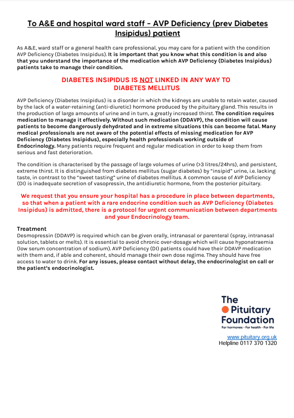 You can use this sheet for A&E visits, to give to ward staff or other general healthcare staff. It says what AVP deficiency is and makes it very clear that it is not related to blood sugar diabetes. It also has information about desmopressin treatment.