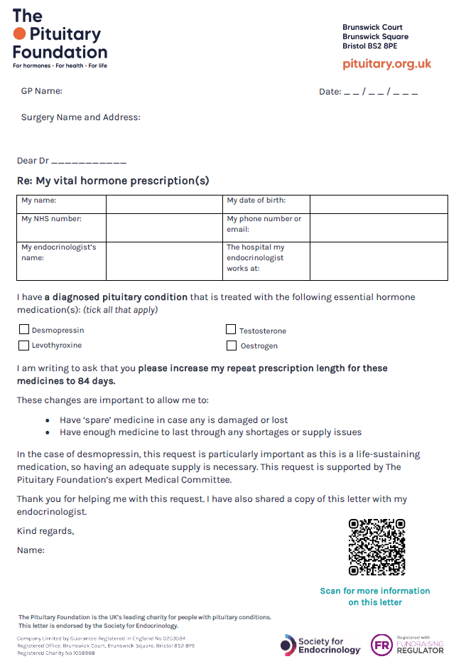 Pituitary hormone prescription template letter for GPs